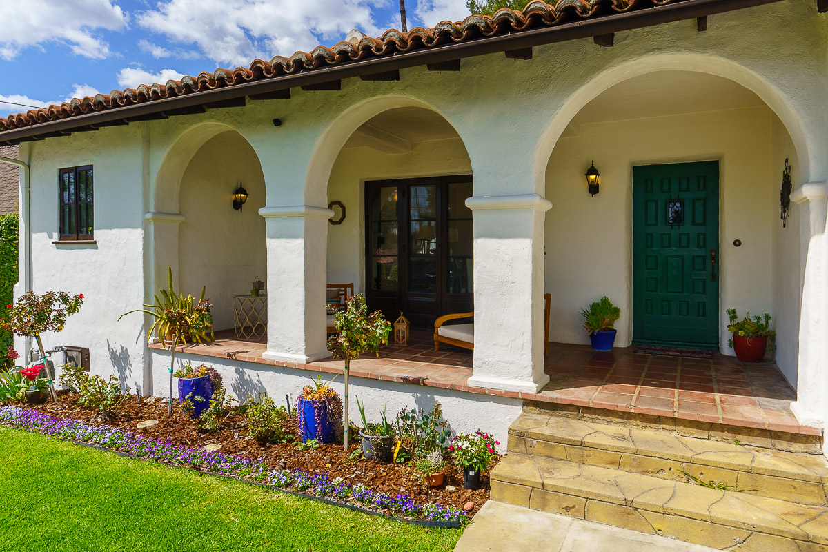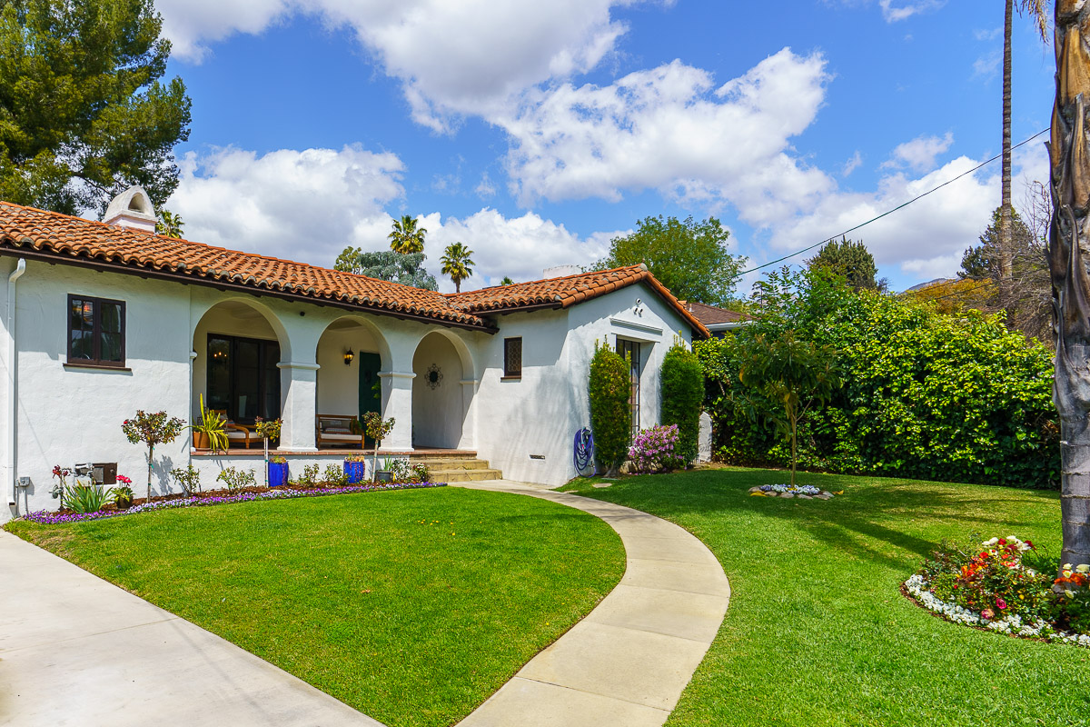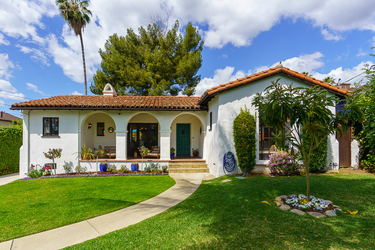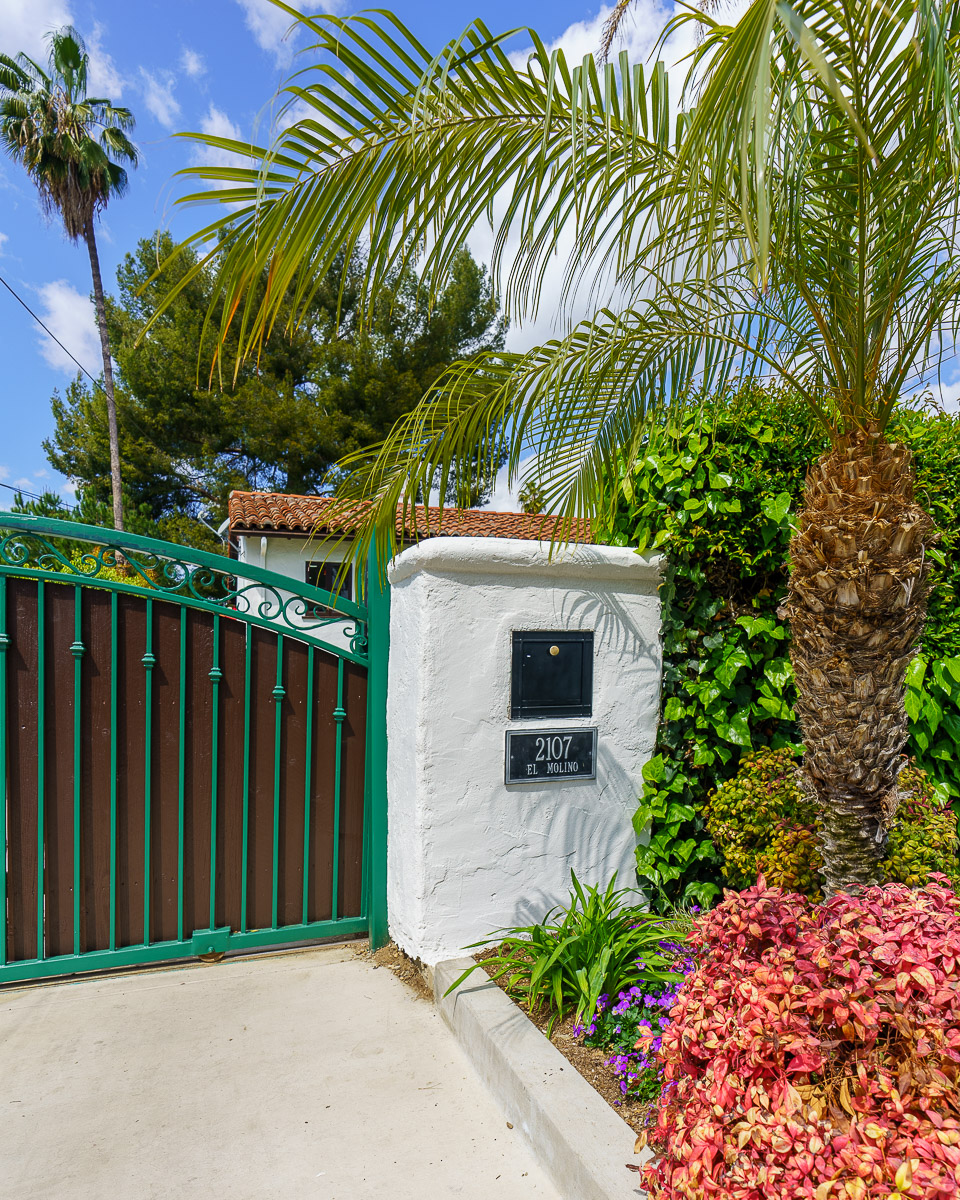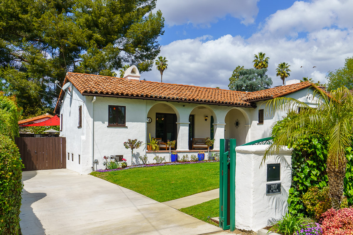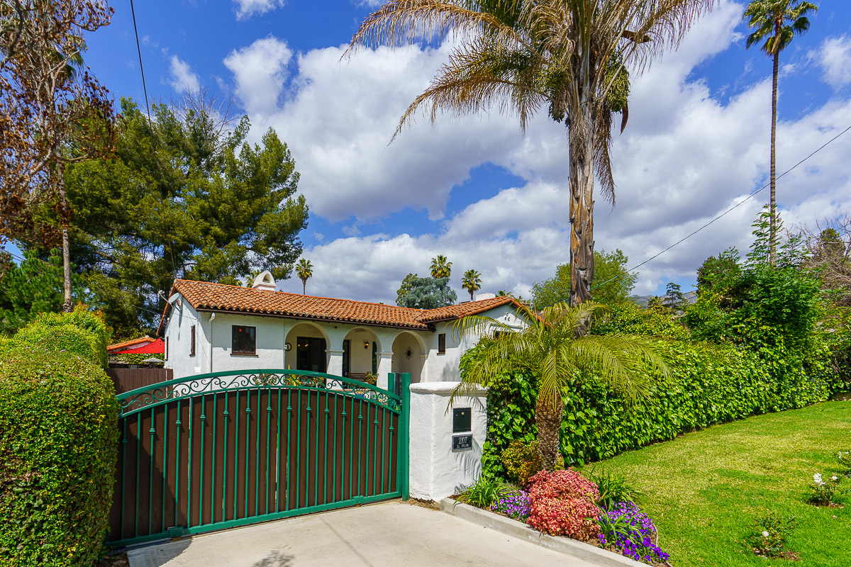 Welcome to this beautiful three bedroom, three bath gated 1928 Spanish Revival with a fantastic bonus workspace in the converted garage. The 1695 square foot house (measured) sits behind a tall private hedge and invites you in with its elegance and grace. The home has incredible character details throughout starting with the expansive living room, with rich hand-hewn beams, that has a center, tall picture window framed by niched, custom built-ins. In addition, there is a light-filled formal dining room, a beautifully remodeled kitchen with glass fronted cabinetry and stainless steel appliances as well as three well-appointed bedrooms at the back of the house, including a luxurious master suite. The property is filled with old-world, architectural elements including period wrought iron fixtures, tall Moorish arched doorways, hand crafted Saltillo tile, a stately fireplace and much more.