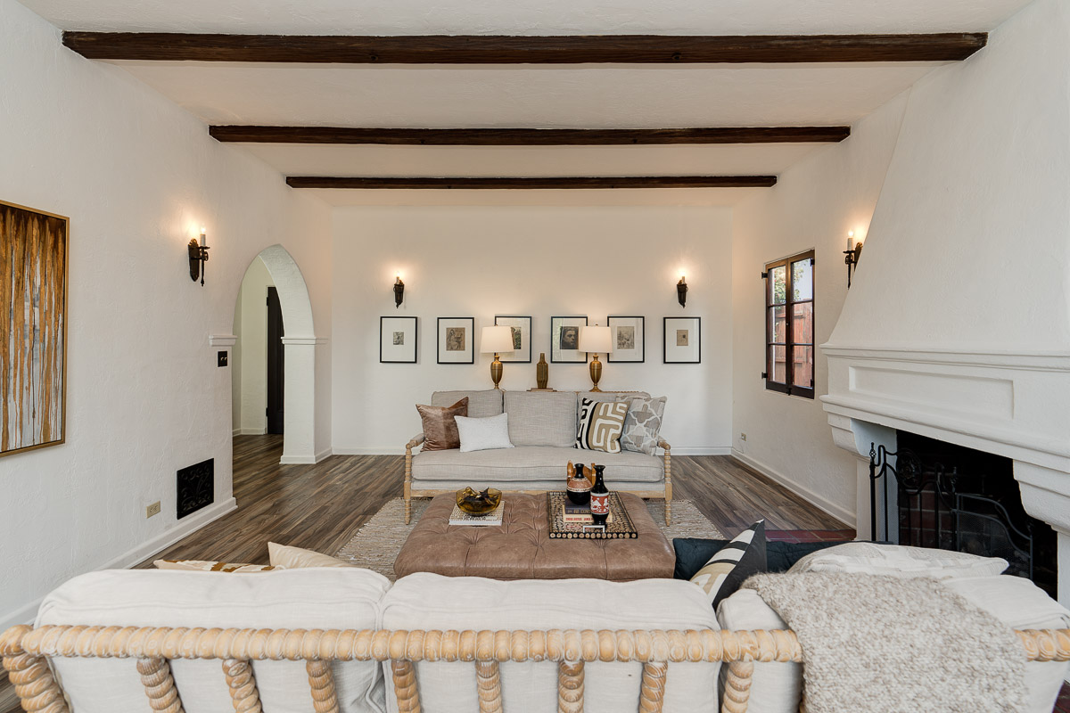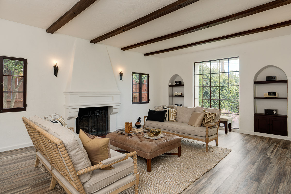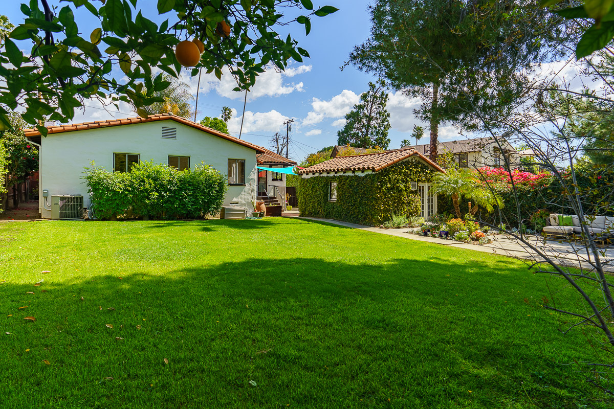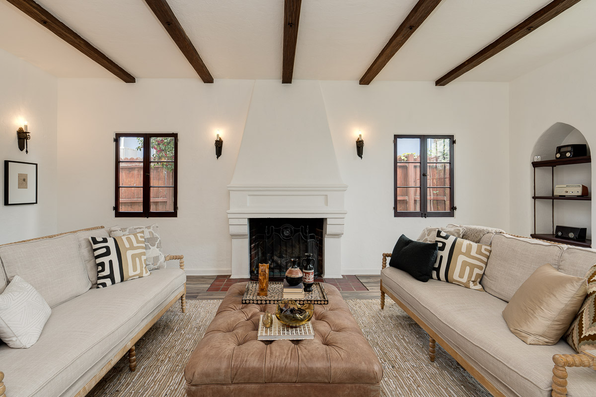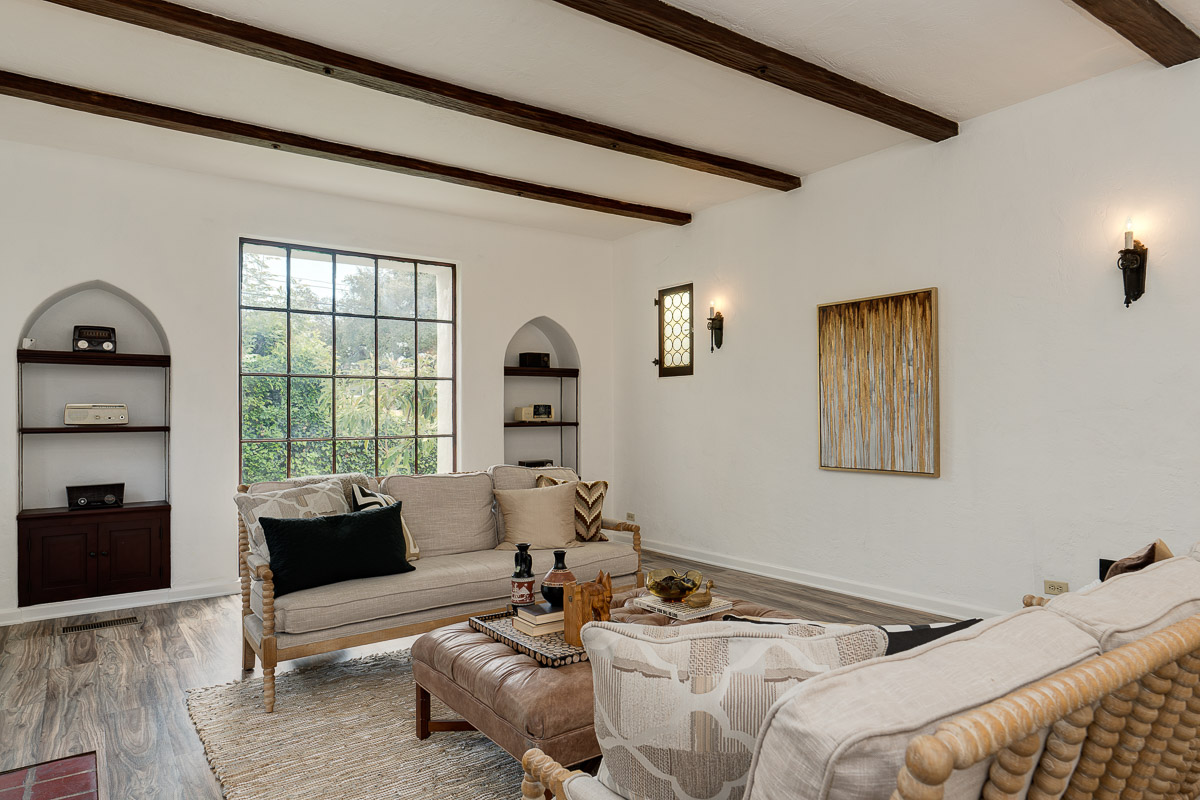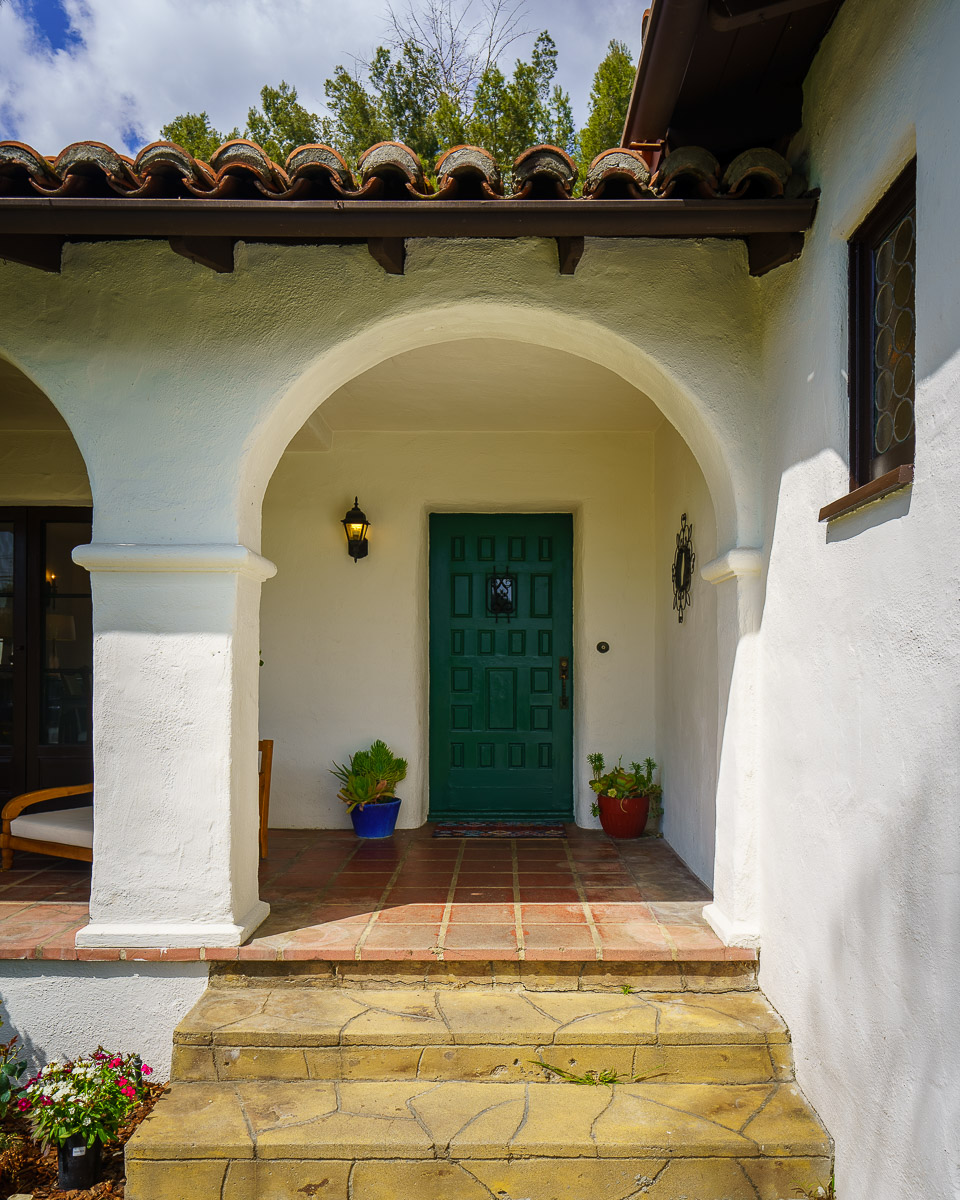 Welcome to this beautiful three bedroom, three bath gated 1928 Spanish Revival with a fantastic bonus workspace in the converted garage. The 1695 square foot house (measured) sits behind a tall private hedge and invites you in with its elegance and grace. The home has incredible character details throughout starting with the expansive living room, with rich hand-hewn beams, that has a center, tall picture window framed by niched, custom built-ins. In addition, there is a light-filled formal dining room, a beautifully remodeled kitchen with glass fronted cabinetry and stainless steel appliances as well as three well-appointed bedrooms at the back of the house, including a luxurious master suite. The property is filled with old-world, architectural elements including period wrought iron fixtures, tall Moorish arched doorways, hand crafted Saltillo tile, a stately fireplace and much more.